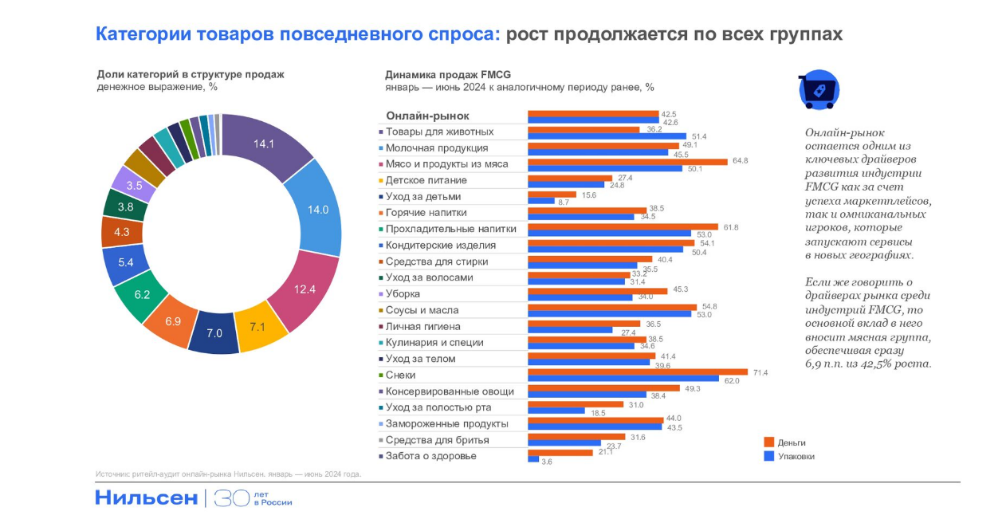 Согласно данным Nielsen, онлайн-рынок увеличился на 42,5% в денежном выражении и на 42,6% в количестве упаковок продукции (за январь-июнь 2024 года по сравнению с аналогичным периодом предыдущего года).