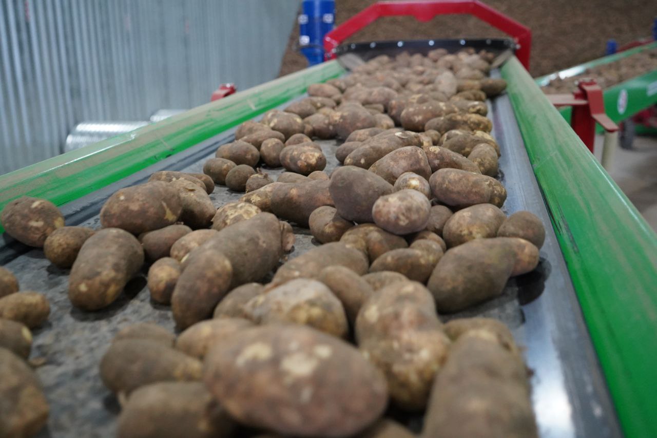 В ходе визита гости ознакомились с технологическим процессом на комплексе: от разгрузки картофеля в приемный бункер мощностью 90 тонн в час до его сортировки и закладки на хранение. Ключевым элементом являются современные каркасные складские помещения, оснащенные системой активного вентилирования. Через сеть воздуховодов обеспечивается равномерная циркуляция воздуха и поддерживаются оптимальные температура и влажность, что гарантирует сохранность урожая.