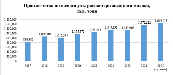 По мнению эксперта, в 2025 году объём ультрапастеризованного молока может достичь 1,65 млн тонн, что на 5% превысит результат 2024 года и на 40% – показатель 2020 года.