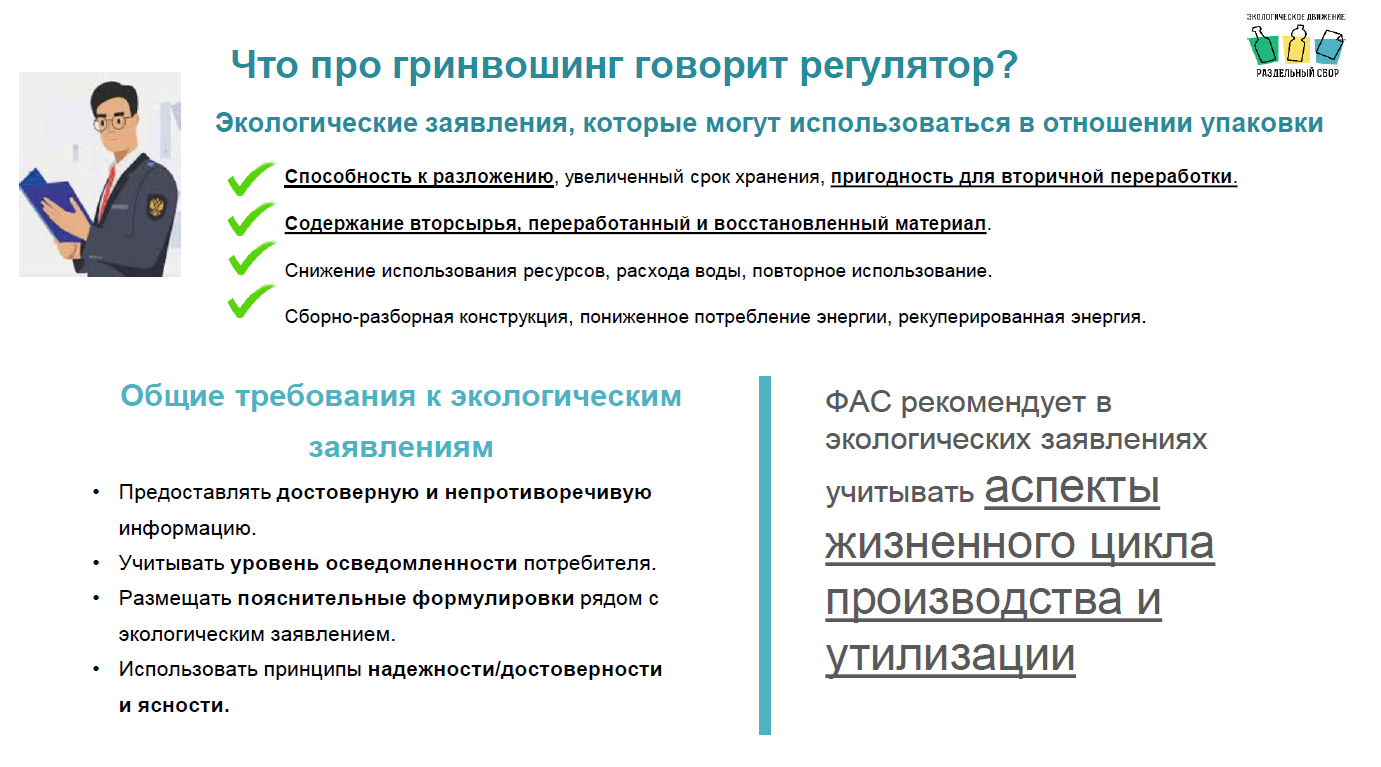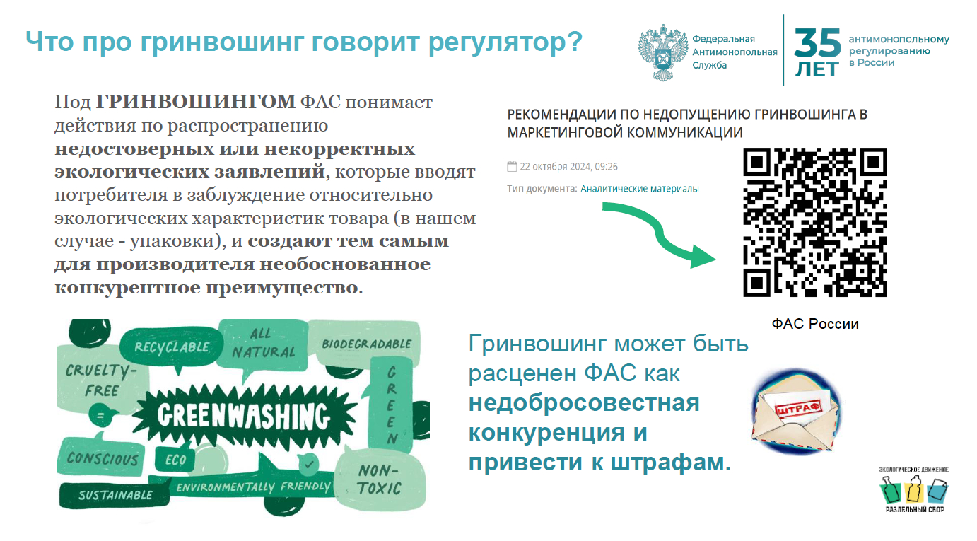 Некоторое время назад вопросами гринвошинга заинтересовалась ФАС и в сотрудничестве с экспертным сообществом выпустила специальные , направленные на противодействие ему. Под гринвошингом ФАС подразумевает действия по распространению недостоверных или некорректных экологических заявлений, которые вводят потребителя в заблуждение относительно экологических характеристик товара (в нашем случае – упаковки). Подобные действия могут быть расценены как недобросовестная конкуренция, и тогда нарушителю “прилетит” штраф.