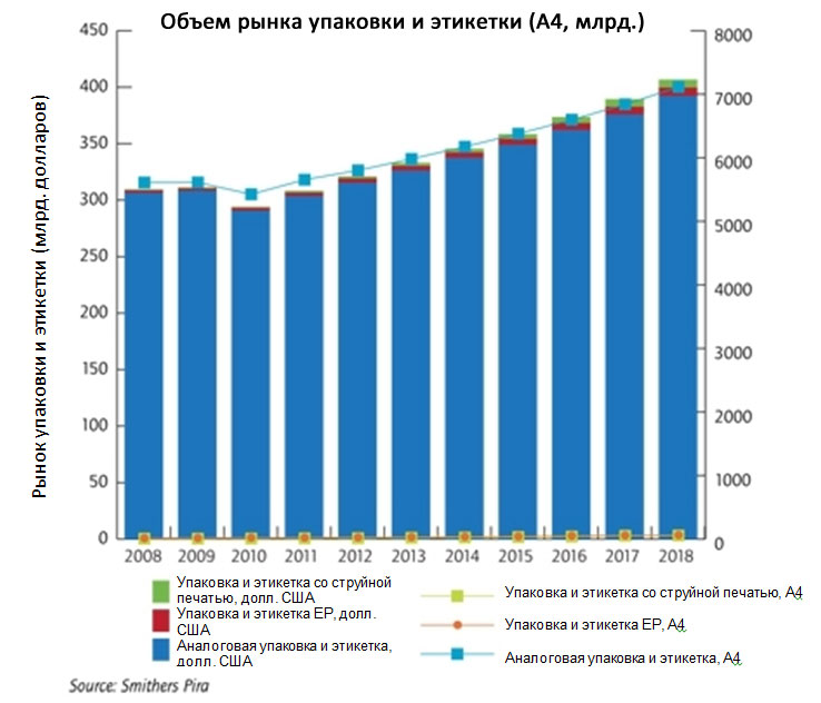 В своем отчете «Будущее цифровой печати для упаковки в период до 2018 г.» Smithers Pira исследует многочисленные факторы этого роста в секторе цифровой печати для упаковочной промышленности. В связи с ростом населения и повышающимся доходом потребителей в промышленно развитых регионах продолжает расти и спрос на упаковку. Между тем средний размер семьи в более развитых регионах снижается, сокращая средние тиражи и в связи с этим подыгрывая сильным сторонам цифровой упаковки. Способность цифровых печатных машин варьировать данные также дает возможность управления версиями и персонализации, равно как и возможность высокого быстродействия малых тиражей. Из-за жестких требований к этикетке для адаптации упаковки и этикетки в соответствии с требованиями заказчика на поздних этапах производства все чаще используется цифровая печать, тенденция, особенно часто наблюдаемая в фармацевтической промышленности.