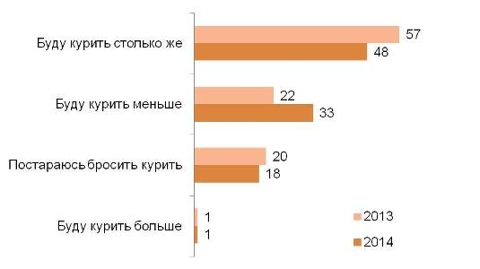 Год назад, когда в силу вступили запреты на курение во всех закрытых общественных местах, связанных с образованием, культурой, здравоохранением, транспортом, также опрашивал россиян на предмет прогнозов об изменении количества курильщиков в связи с этими ограничениями. Любопытно, что прошлогодние прогнозы полностью совпали оценками этого года. Исследование также показало, что запреты на курение все же заставляют самих курильщиков менять свое поведение. Так, например, в этом году на 11% больше курильщиков, чем годом ранее, заявили, что постараются курить меньше. Хотя доля тех, кто задумывается о полном расставании с сигаретами, практически не изменилась – с 20% год назад до 18% в этом году.