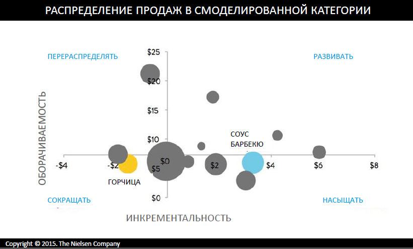 Разница между ними заключается в уровне инкрементальности в рамках категории. Инкрементальность соусов для барбекю выше среднего, что говорит о возможности наращивать его дистрибуцию, в то время как ассортимент горчицы слишком велик. В данном случае целесообразным было бы освободить место для соусов барбекю, убрав с полки горчицу с низкими показателями. Эффективный ассортимент будет работать на рост продаж.