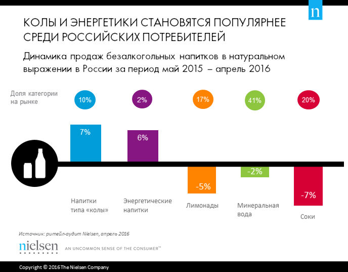 На сегмент напитков типа «колы» приходится 10% продаж рынка безалкогольных напитков в натуральном выражении, и за последний год продажи в сегменте приросли на 7%. Интересно, что другие газированные напитки – например, лимонады, – стали менее популярны у россиян: их продажи за аналогичный период сократились на 5% в натуральном выражении.