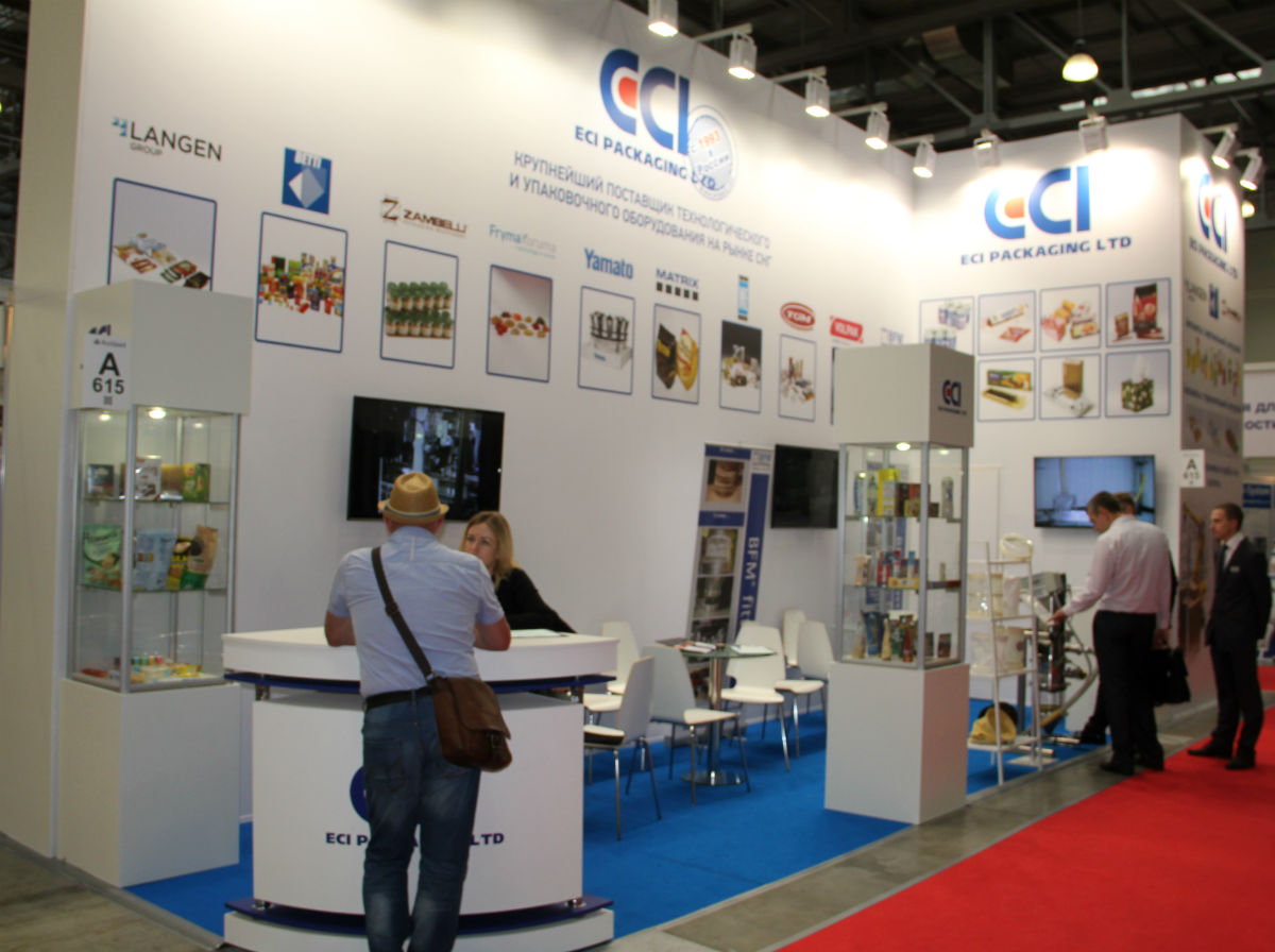 Как практически всегда был очень интересен стенд компании-поставщика «Золотой шар». Кстати, интересное решение по наполнению стенда продемонстрировало это предприятие. Кроме демонстрации техники «живьем», некоторые особенно крупные изделия, предлагаемые компанией, были представлены макетами. В этот раз стояли копии итальянской техники: автоклава производства Panini и технологической линии по выпуску кондитерских изделий компании FIS. Этот опыт, думается, стоит перенять поставщикам и производителям крупной техники. Ведь ее не всегда поставишь на стенд. Плакаты и экраны – это хорошо, но, на мой взгляд, железное изделие, пусть и в миниатюре, привлекает больше внимания. Из непосредственно техники, представлененой на стенде, наше внимание привлёк упаковочный автомат FP 500 HSE производства SmiPack (Италия) в комплекте с термотоннелем. Упаковываются предметы достаточно крупные в плане, но с небольшой высотой изделия (например, печатные издания) производительностью до 4500 упаковок в час.