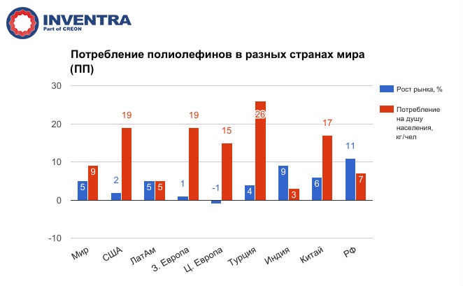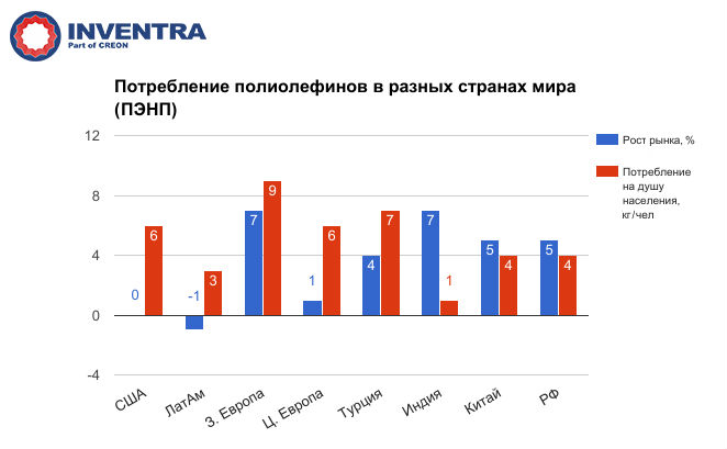 В 2016 г. РФ занимала лидирующие позиции в мире по динамике роста потребления ПП и ПЭНП, хотя в абсолютном выражении по-прежнему продолжает отставать от среднемирового уровня использования полиолефинов на душу населения. Другими словами, у России остается достаточно высокий потенциал для роста потребления данных видов пластиков и его необходимо использовать.