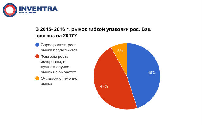 Своим мнением о перспективах рынка гибкой упаковки в 2017 г. поделились все участники конференции. В результате интерактивного опроса выяснилось, что более половины респондентов не рассчитывают на положительную динамику.