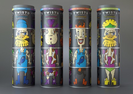 Большая порция чипсов Twistd разделена на четыре части, которые образуют пирамиду из тубусов. В упаковках – разные виды чипсов с необычными вкусами: чили и шоколад, морская соль и водоросли, соус BBQ и мед, сыры чеддер и стилтон. В крышке есть отделения с разными специями, добавляя которые, можно получать неожиданные вкусы. Персонажи такие же неожиданные, как и вкусы: девушка-ковбой и рыбак-хипстер.