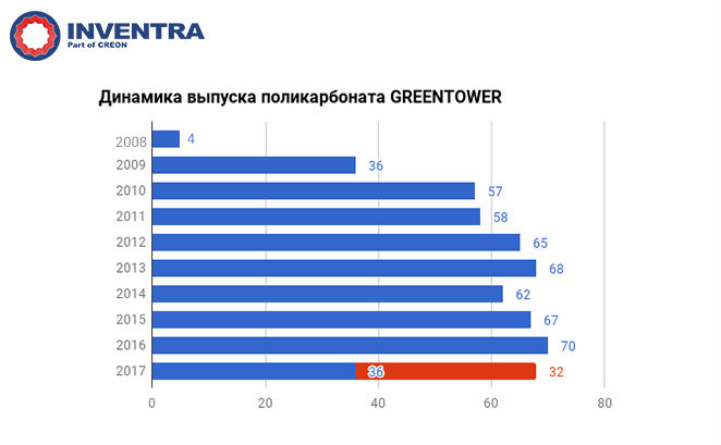 Несмотря на такие тревожные сигналы, результаты первой половины 2017 г. показали, что после двух лет падения рынок поликарбоната начал оживать. По мнению аналитика группы CREON, растущий спрос на ПК будет удовлетворяться за счет роста поставок импортной продукции и снижения экспорта, поскольку единственный отечественный производитель - «Казаньоргсинтез» - в последние годы работает с максимальной загрузкой мощностей и не имеет возможности увеличить выпуск продукта. По итогам 2017 г. объем производства поликарбоната снизится на 3 тыс. т относительно прошлогоднего показателя, что связано с остановкой завода на плановый ремонт, и составит 68 тыс. т.
