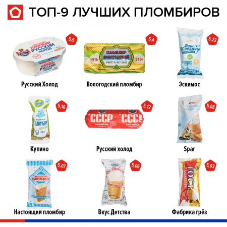 Топ-5 по органолептике среди товаров без нарушений составили пломбиры «Чистая линия» (5,1 балла), «Вологодский пломбир» (5 баллов), «Филевский» («Айсбери», 4,95 балла), «Настоящий пломбир» (ИП Шибаланская А.А., 4,6 балла), «Русский Холод» и «Коровка из Кореновки» (по 4,5 балла). Любопытно, что высшую оценку в 5,5 балла за органолептику получили товары с нарушениями «Ваш пломбир» (заниженная жирность) и «Село зеленое» (недовес).