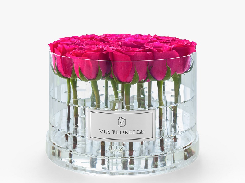 В результате североамериканский производитель создал прозрачный цилиндрический контейнер из кристаллического акрила. В контейнере помимо дна есть плоские вкладыши с отверстиями. В каждое отверстие вставляется 1 стебель, что помогает его надежно фиксировать. При этом весь цветок отлично видно через прозрачные стенки. Как оценивают сами создатели, такая упаковка позволяет цветам «выглядеть соблазнительно».