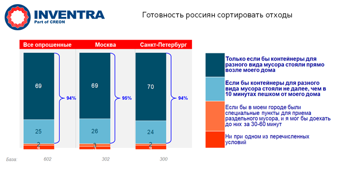 Эксперт сообщила, что подавляющее большинство жителей страны (порядка 94-95%) готовы сортировать отходы, если контейнеры для разного вида отходов будут стоять возле жилого дома или не далее, чем в десяти минутах пешком от жилого комплекса. Возможное решение проблемы г-жа Иванова видит во внедрении контейнеров для двухпотокового сбора мусора в каждом дворе, что гарантирует максимально быстрый результат в короткие сроки и удобство для населения.