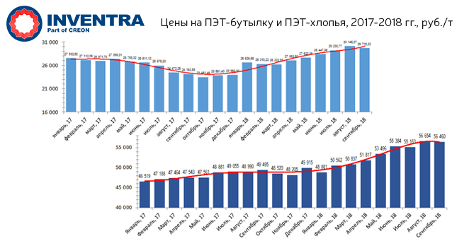 Докладчик также сообщил, что в 2018 г. произошло повышение цены на первичный ПЭТ на 50-70% за счет общемирового «ПЭТ-кризиса» (дефицит и рост цен на протяжении 16 месяцев) и роста курса доллара на 15-20%. Помимо этого, на рынке вторичного ПЭТ наблюдается устойчивый спрос со стороны потребляющих отраслей и дальнейший рост интереса к использованию вторичных полимеров, цена на которые с начала года также повысилась на 30-40% (до 35 руб./кг ПЭТ-бутылки).