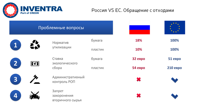 Норматив утилизации бумаги в России по состоянию на 2018 г. составляет в среднем около 18%, а пластика – 10%, притом, что в странах ЕС, лидирующих по вторичной переработке, цели по утилизации практически с самого начала были установлены на уровне свыше 60% на оба материала. При этом производители товаров в странах-лидерах ЕС несут стопроцентную финансовую ответственность за весь цикл движения упаковки своих товаров от момента потребления до попадания на переработку, мусоросжигательный завод или полигон. Таким образом, производитель, во-первых, должен «убрать» 100% своей упаковки, а уже во-вторых, обеспечить попадание в переработку определенного процента отходов, например, 70% для бумажной упаковки в Германии. В России же ответственность ограничена размером нормативов утилизации, которые установлены на критически низком уровне. Также г-н Сергеев добавил, что в России отсутствует административный контроль РОП, в отличие от стран Европейского Союза, а также принят запрет на вторичное захоронение сырья, эффект от которого в текущем виде будет минимальным.