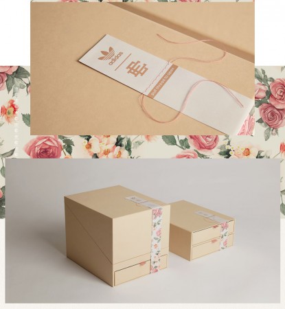 Коробка выполнена в виде шкатулки. Чтобы открыть упаковку, сначала нужно потянуть за нитку, благодаря чему разорвется бумажная лента. Под ней покупатель обнаружит послание от дизайнера Эрика Эмануэля. Кстати, бумажная лента прошита такими же нитками, как и сами кроссовки adidas.
