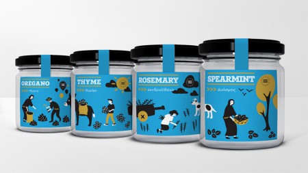В студии разработали серию иллюстраций, описывающих не просто процессы сбора и производства, а образ жизни греческой провинции. Линейка интересна тем, что работа выполнена таким образом, что одна иллюстрация дополняет другую. Правильно расставив банки, можно увидеть пошагово процесс сбора сырья и изготовления приправ.