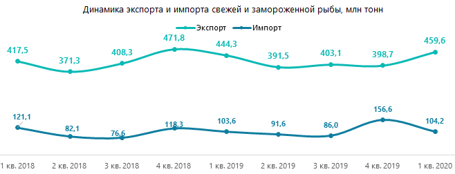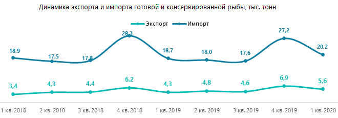 Еще один положительный фактор развития рынка — рост экспортных поставок рыбы. В 1 квартале 2020 г. экспортные поставки готовой и консервированной рыбы в натуральном выражении увеличились на 23% по сравнению с 1 кварталом 2019 года. За этот же период поставки свежей и замороженной рыбы выросли на 3%. Ослабление рубля делает российскую продукцию более конкурентоспособной на зарубежных рынках.