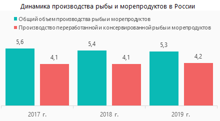 В 2019 году российскими предприятиями суммарно было произведено 4,2 млн тонн переработанной и консервированной рыбы и морепродуктов. В последние 3 года этот показатель был довольно стабильным: 4,1 млн тонн в 2017 и 2018 годах и рост на 2,3% в 2019-м. При этом общий объем выпуска изучаемой продукции снизился за счет уменьшения производства свежей рыбы (-5,4%).