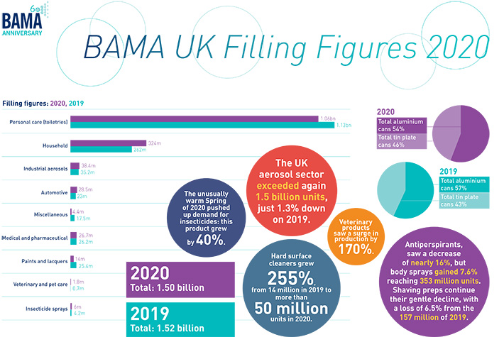 Ежегодное исследование, проведённое Британской ассоциацией производителей аэрозолей (BAMA), показало, что сектор аэрозолей быстро приспособился к изменившимся обстоятельствам во время пандемии Covid-19 и введения национальных ограничений, отвечая на новые потребности рынка, несмотря на сложную ситуацию. Согласно результатам исследования, общее производство аэрозолей в 2020 г. превысило 1,5 млрд единиц, что всего на 1,3% меньше, чем в 2019 г.