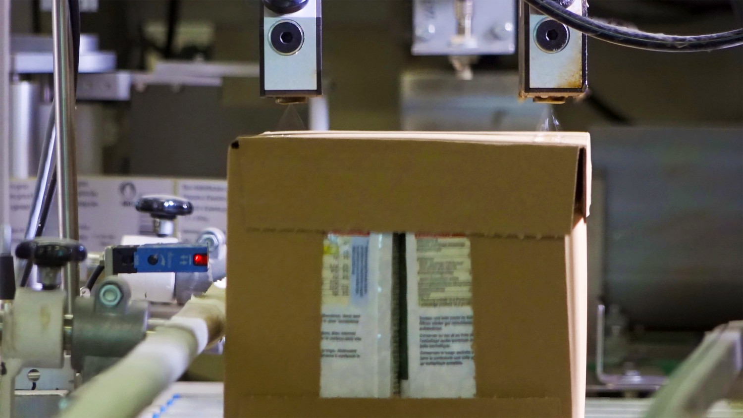 С начала 2020 г. две спреевые головки AX Diamond точечно наносят клей прямо на верхнюю часть упакованных коробок для хлопьев. На картонные коробки последнего слоя клей не наносится. Это обеспечивается благодаря контроллеру управления в плавителе Concept. Он напрямую взаимодействует с системой управления робота-палетоукладчика.
