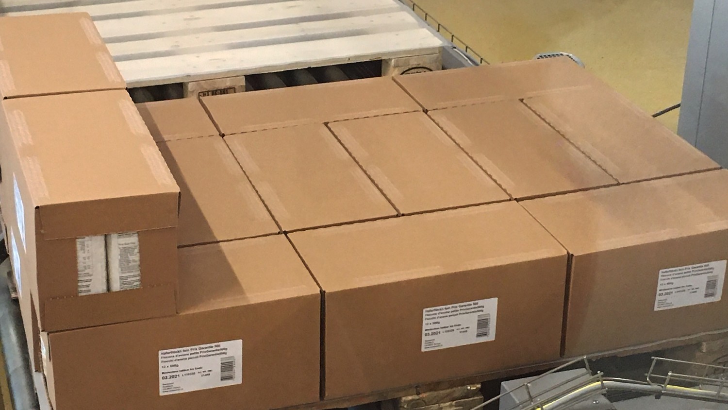 Но сначала не всё шло гладко. Клиент пожаловался на смятые картонные коробки в нижнем ярусе поддонов при некоторых поставках. Хорошо известно, что даже при использовании термоусадочной плёнки возможно повреждение из-за сильных движений. Толщина коробки играет важную роль в распределении нагрузки, особенно когда поддоны подвергаются большим усилиям сдвига во время транспортировки. «Однако мы быстро нашли хорошее решение, – говорит Эрвин Вальдфогель. – Для поддонов, перевозимых по железной дороге, мы оборачиваем их стретч-плёнкой после нанесения клея-расплава, но только наполовину. Этого достаточно для обеспечения равномерного распределения нагрузки и предотвращения разрушения картонной коробки».
