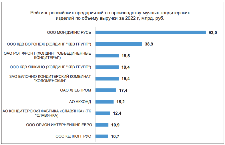 Крупнейшими компаниями по производству мучных кондитерских изделий стали ООО «МОН'ДЭЛИС РУСЬ», ООО «КДВ ВОРОНЕЖ» (ХОЛДИНГ "КДВ ГРУПП"), ОАО «РОТ ФРОНТ» (ХОЛДИНГ "ОБЪЕДИНЕННЫЕ КОНДИТЕРЫ"). Эти компании продемонстрировали наибольшие показатели по выручке по итогам 2022 г. Всего в России действует порядка 140 предприятий по производству мучных кондитерских изделий. Суммарно выручка всех компаний, вошедших в рейтинг, в 2022 г. составила 415,3 млрд руб., это на 21.2% выше показателей 2021 г. (342,5 млрд руб.)