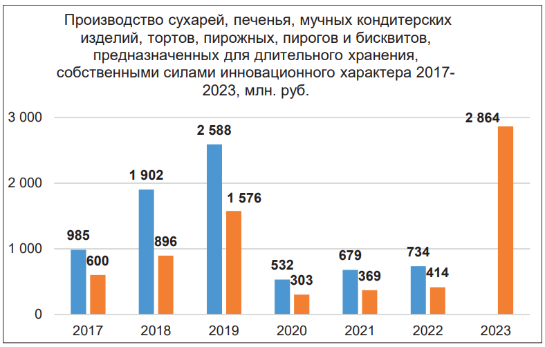 Согласно статистическим данным в обобщенной категории производства сухарей, печения, прочей сухарной продукции, тортов, пирожных, пирогов, бисквитов для длительного хранения после спада, вызванного пандемией Covid-19, происходит рост инновационного производства. Интересно, что в текущем году за 7 месяцев произведено уже больше продукции, чем в предыдущий пиковый период – 2019 год. Сейчас за период с января по июль произведено продукции на 2864 млн руб., за полный 2019 г. произведено и отгружено продукции на 2588 млн. руб. Однако следует помнить, что цены на продукцию были ниже.