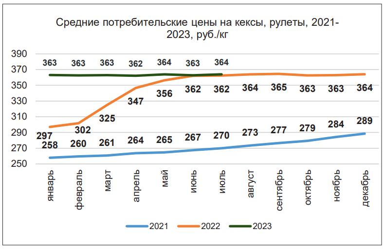 А как ведут себя цены? До мая 2022 г. аналитики наблюдали постепенный рост розничных цен на такие категории мучных кондитерских изделий, как торты, кексы и рулеты. С лета прошлого года цены остаются примерно на одинаковом уровне и не растут.