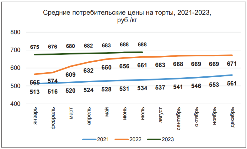 Примерно с лета 2022 г. началась стабилизация рынка, и в настоящее время ситуацию на нем можно охарактеризовать как сдержанно оптимистическую. Если сопоставлять цены на мучные кондитерские изделия в крупных федеральных сетях РФ по первому полугодию 2022 и 2023 гг., то можно отметить небольшой спад (-2,6%), который произошел из-за большей сырьевой зависимости, несмотря на органический рост торговых точек федеральных сетей.
