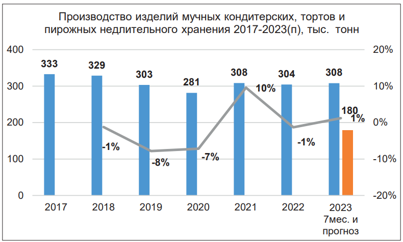 По итогам 2022 г. было произведено 304 тыс. тонн мучных кондитерских изделий недлительного хранения и 102 тыс. тонн длительного хранения (без учета замороженных кондитерских изделий). За семь месяцев текущего года было произведено 180 тыс. тонн мучных кондитерских изделий недлительного хранения и 63 тыс. тонн длительного хранения. Аналитики отмечают, что кондитеры сумели компенсировать спад производства, зафиксированный в прошлом году, по предварительным оценкам годовое производство по каждой из категорий будет примерно на уровне прошлого года или чуть выше, и вероятно, отрасль сможет нивелировать санкционные потери.