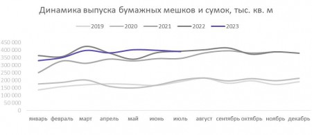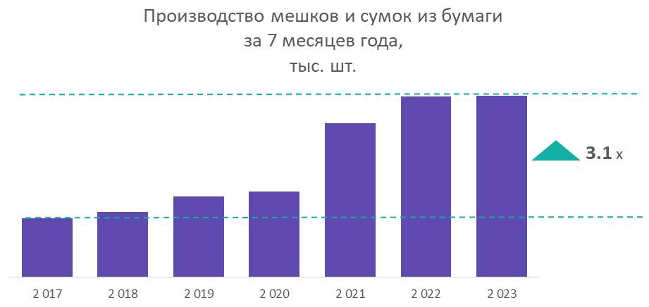 Замедление выпуска коснулось и сегмента бумажных мешков и сумок, который в прежние годы рос особенно быстро: по итогам 2020 г. – на 7%, по итогам 2021 г. – на 83%, по итогам 2022 г. – на 10%. А в 2023 г. данные за январь-июль впервые с 2017 г. показывают нулевой прирост. Тем не менее, производства бумажных мешков и сумок с 2017 г. выросло в 3 раза.