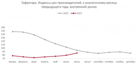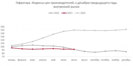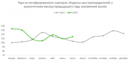 Динамика цен производителей на ящики и коробки из негофрированного картона разнонаправленная: в январе 2022 г. цены вернулись на уровень января 2021 г., в апреле 2022 г. выросли и превысили уровень апреля 2021 г. на 24%, к августу вернулись на уровень августа 2021 г., к ноябрю 2022 г. снова превысили прошлогодний уровень, уже более чем на ¼. Динамика 2023 г. также неравномерная: в январе цены на картонные ящики и коробки были на 33% выше прошлогоднего уровня, в апреле практически вернулись на уровень апреля 2022 г. (который был довольно высоким), в мае-июле превысили значения предыдущего года на 10-20%. Но если посмотреть на отношение цен к декабрю 2022 г., то в июне и июле уровень цен производителей на негофрированную тару был на пару процентов ниже.