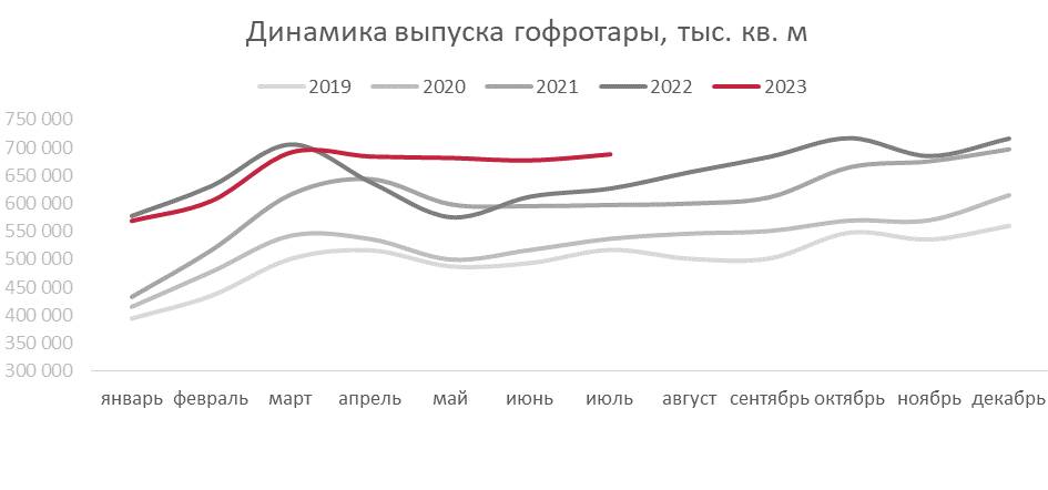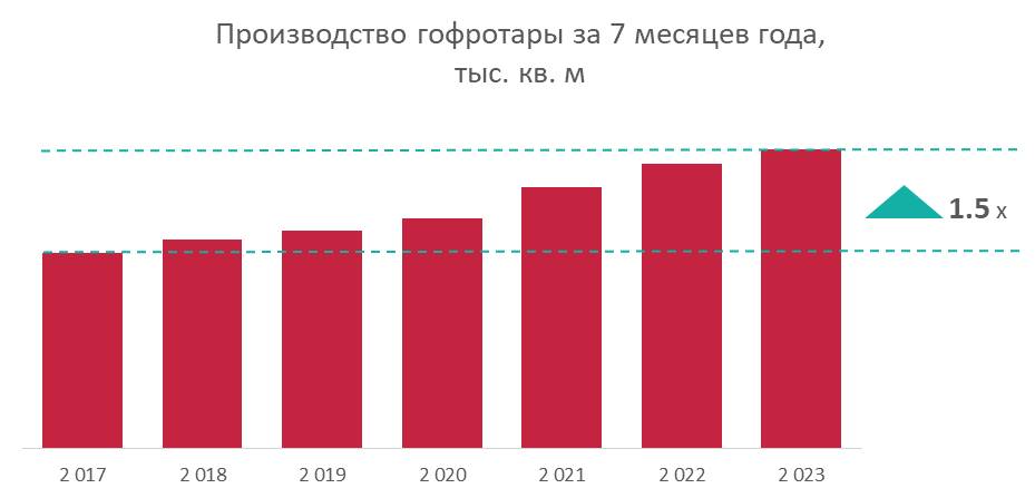 В 2022 г. положительная тенденция роста производства гофротары, наблюдавшаяся в последние годы, прерывалась лишь на несколько месяцев, в апреле и мае. По итогам года темпы прироста рынка были положительными. В 1 квартале 2023 г. выпуск гофрированных ящиков и коробок повторил динамику 1 квартала 2022 г., отставая от значений 2022 г. на несколько процентов, а во втором квартале 2023 г. производство гофротары выросло на 12%. В результате прирост производства гофрированной тары за 7 месяцев 2023 г. составил 5%. А за период с 2017 г. выпуск тары из гофрокартона и гофробумаги увеличился в 1,5 раза.