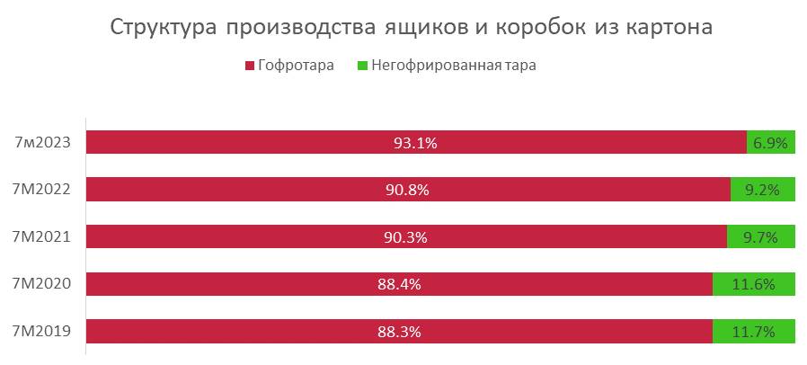 Закономерно, что доля негофрированной тары в структуре выпуска картонной тары в 2023 г. также сократилась. По результатам семи месяцев 2023 г. доля тары из негофрированного картона составила 6,9%. За последние 5 лет она снизилась почти на 5 процентных пунктов.