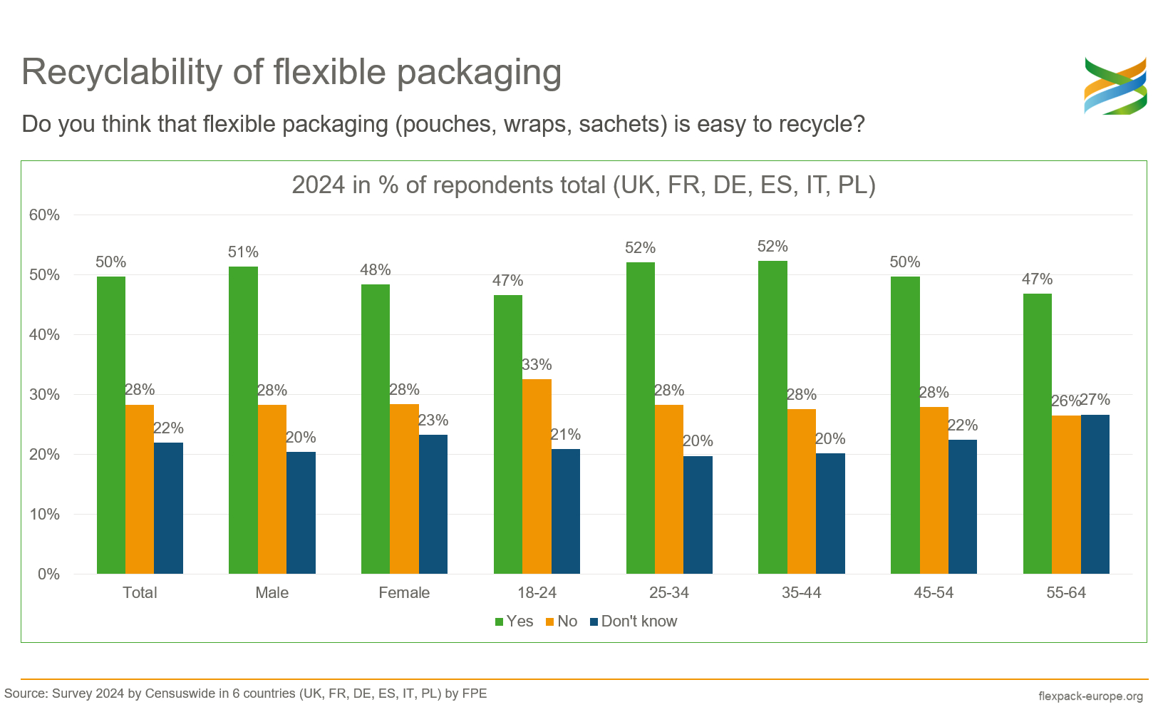 Что касается экологичности, половина всех респондентов ответила, что они воспринимают гибкую упаковку как пригодную к вторичной переработке. Хотя есть некоторые различия между странами (например, 65% – в Испании, 58% – в Италии, 40% – в Германии и 38% – в Польше), различия между возрастными группами и полами лишь незначительны.