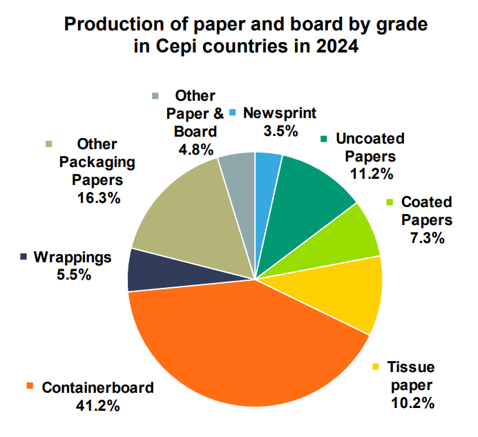 В зависимости от показателей переработки в секторе, рост был в основном обусловлен упаковкой, двигателем роста в течение последних десятилетий. Производство упаковочных сортов, которые являются крупными потребителями бумаги для вторичной переработки, увеличилось на 6,5% по сравнению с 2023 г. Сейчас на них приходится почти две трети общего объёма производства бумаги и картона – 63,0%.