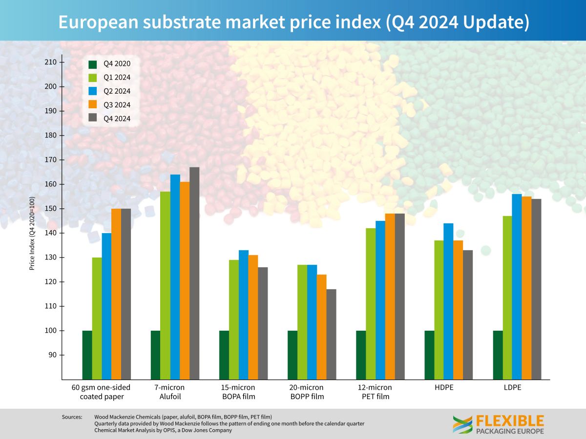 Европейская ассоциация гибкой упаковки FPE опубликовала данные по ценам на гибкие упаковочные материалы (бумагу, алюминиевую фольгу и пластик) за последний квартал 2024 г., которые показывают смешанную картину.