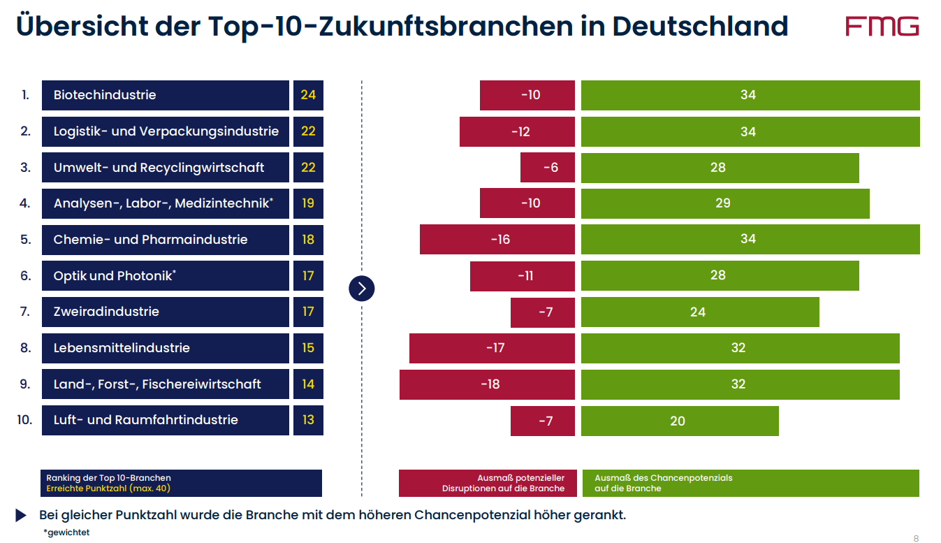 Согласно исследованию, наиболее перспективными и надежными секторами будущего для обрабатывающей промышленности Германии на период с 2025 по 2040 г. больше не являются автомобильная промышленность или электротехническая и электронная промышленность. Вместо этого на первом месте находится биотехнологическая отрасль, за ней следуют логистика и упаковочная промышленность, а также экологическая отрасль и индустрия вторичной переработки.