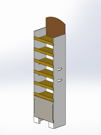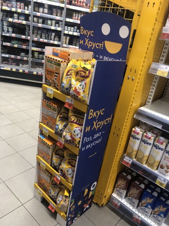 Еще одна разработка компании — витринная стойка для товаров (патент на изобретение RU 2714629). Это торговое оборудование из гофрокартона, предназначенное для презентации продукции в магазинах. Стойка представляет собой узкую стеллажную конструкцию с полками, которая: