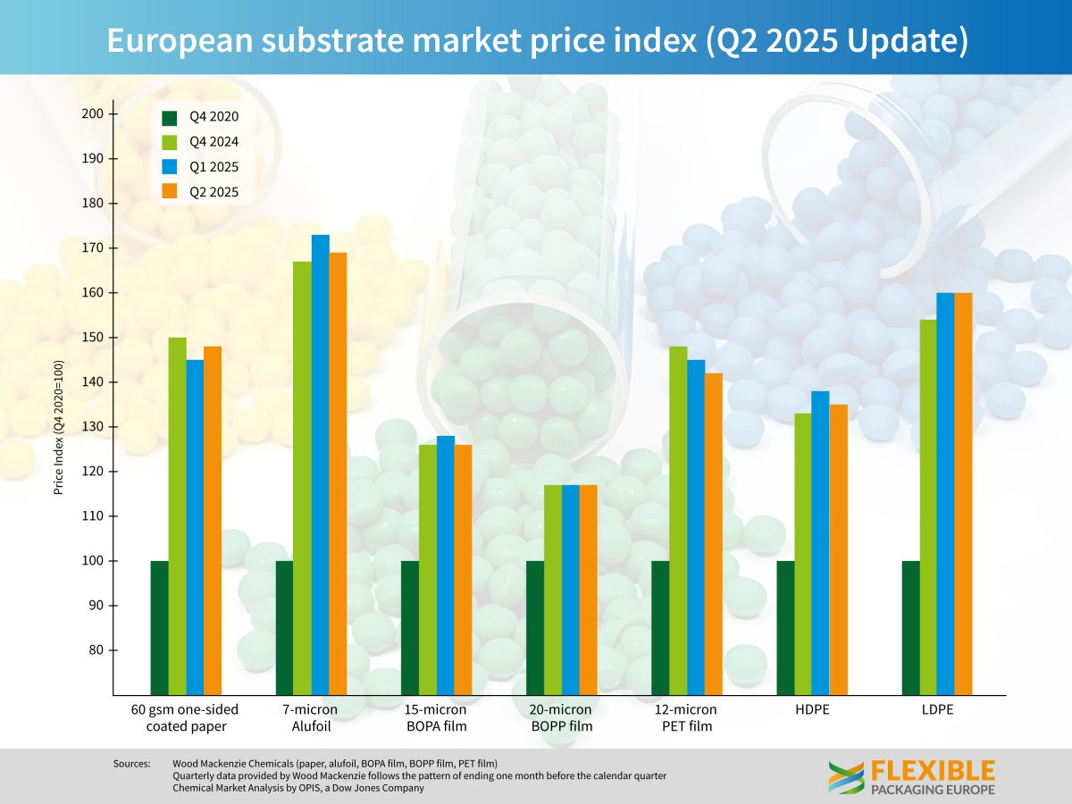 По словам Александра Ткаченко, аналитика Wood Mackenzie, цены на BOPP-плёнку снизились на 5 центов/кг, в основном за счёт зарубежных производителей. Снижение цен было обусловлено увеличением доступности транспортных мощностей из Азии в Европу и ростом курса евро по отношению к доллару США. Некоторые европейские производители не меняли цены в этом году. Цены на BOPP-плёнку остаются стабильными. Спрос в 2025 г. пока слабый, как и в 2024 г. Плёнка BOPA: цены снизились на 5 центов/кг. Цены на алюминиевую фольгу снизились в среднем на 25 центов/кг». Говоря о динамике цен на бумагу одностороннего мелования (60 г/м²) для гибкой упаковки, Александр Ткаченко добавил, что цены в Европе выросли на 3 цента и теперь находятся в диапазоне от 1,48 до 1,73 евро/кг: «Рост обусловлен расходами на электроэнергию, рабочую силу и другими производственными расходами. Ожидалось, что цены вырастут ещё больше, учитывая низкую рентабельность отрасли».