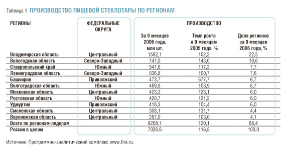 В промышленности регионов-лидеров стеклотарная отрасль занимает от 0,23% (как в Башкирии) до 6,84% (во Владимирской области) по «отгрузке товаров собственного производства»*. При этом за 9 месяцев 2006 года по сравнению с аналогичным периодом 2005-го в 8 регионах из 11 темпы роста отрасли опережали темпы роста промышленности в целом.