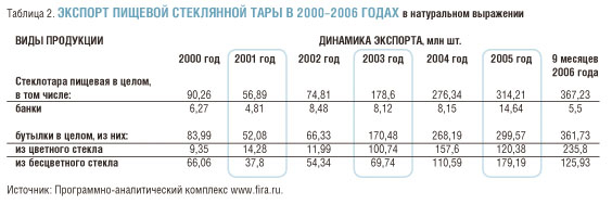 Между тем экспортные поставки в этот период увеличились, продолжив тенденцию роста, наблюдаемую с 2002 года. По итогам 2005 года, было экспортировано уже в 5,5 раза больше единиц пищевой стеклянной тары, чем в 2001-м.