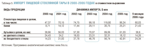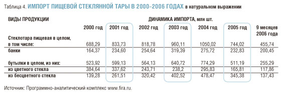 В структуре импорта пищевой стеклотары также доминирует узкогорлая продукция. Однако ее доля несколько ниже, чем в структуре экспортных поставок. Так, в период с 2000 по 2005 годы доля бутылок находилась в диапазоне 67–76% в натуральном исчислении и 71–82% в стоимостном. По итогам января–сентября 2006 года удельный вес стеклобутылки в натуральном объеме импорта впервые за 7 лет составил менее 60%.