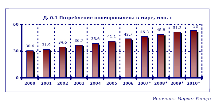 По данным , в настоящее время на мировом рынке полипропилена (ПП) сохраняется стабильная тенденция роста общих объемов потребления. По предварительным оценкам, в 2006 году мировое потребление ПП составило 43.7 млн., а к 2010 году оно вырастет до уровня 53 млн. тонн.