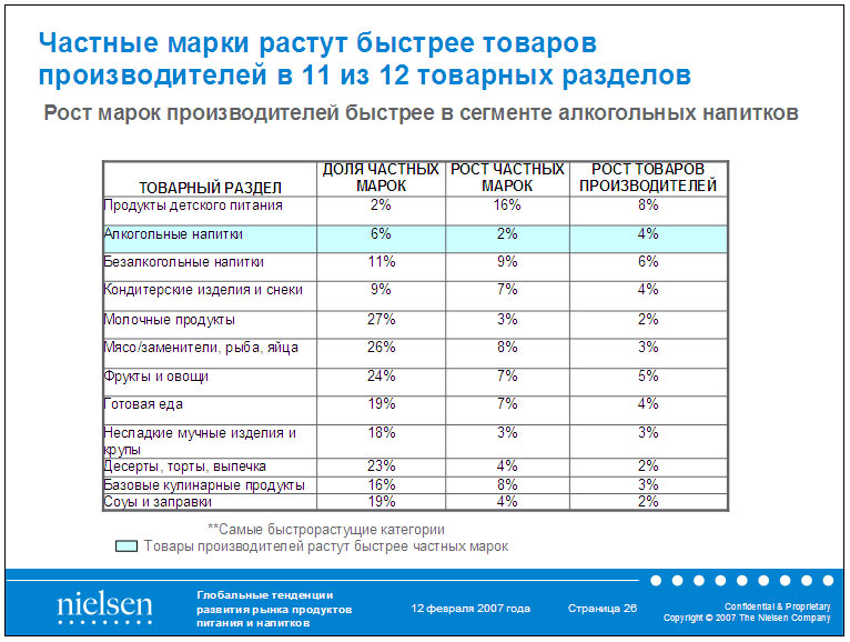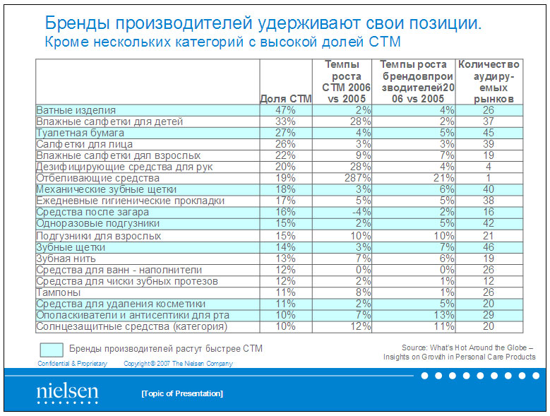 Рис. 4 Динамика роста частных марок и брендов производителей на глобальном рынке Средств персонального ухода. Данные Nielsen, 2007 год.