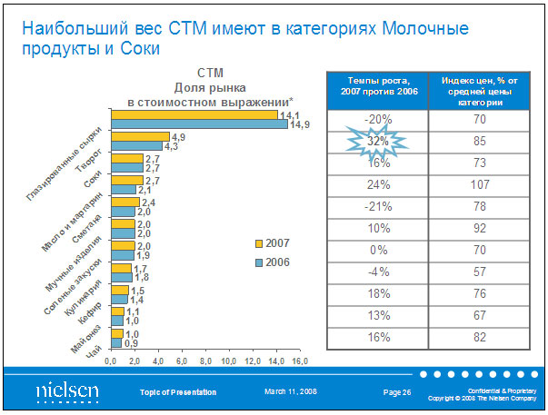Несмотря на незначительную долю СТМ в общем объеме продаж продовольствия в России, в отдельных категориях доля СТМ превышает 10%, так, по данным за период декабрь 2006-ноябрь 2007 доля товаров под собственными марками доходит до 14% (глазированные сырки). Наибольший вес частные марки имеют в молочных продуктах и соках. (Рис. 5). При этом темпы развития СТМ в России в разы выше среднеевропейских. Это объясняется в том числе и более высокими темпами роста отечественного рынка продуктов питания и напитков.
