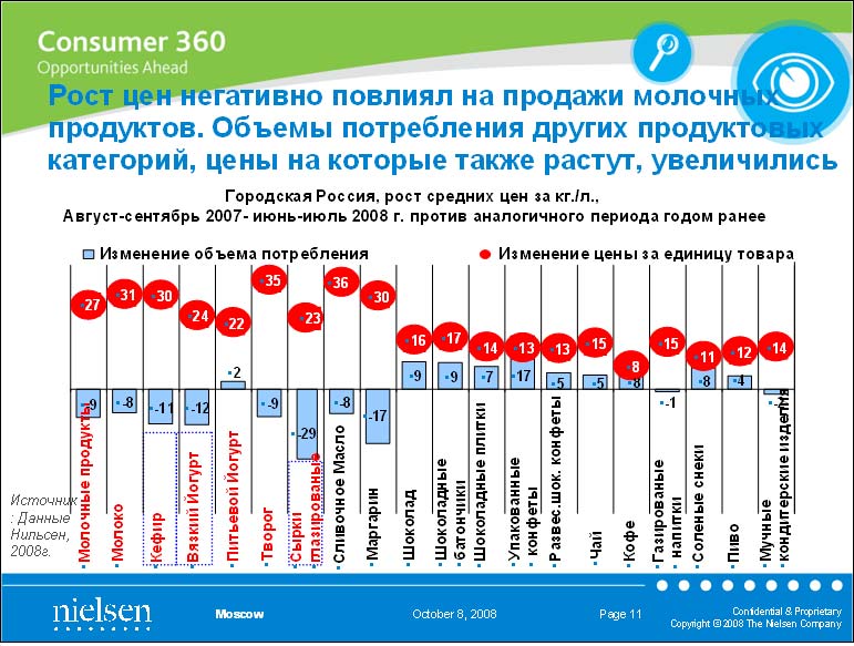 «Несомненно инфляция серьезно сказалась на динамике продаж в денежном выражении. Чтобы снизить ее влияние на семейные бюджеты россияне уменьшают объем и ассортимент своей потребительской корзины и переключаются на другие розничные каналы. При этом темпы продовольственной инфляции серьезно различаются от категории к категории», – говорит Дуайт Уотсон, генеральный директор «Nielsen Россия».