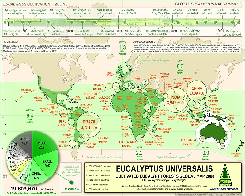Кроме Бразилии, ареной развития производства эвкалиптовой целлюлозы являются Чили, Уругвай, Эквадор и другие страны. В конце 2008 г. португальская компания Portucel Soporcel подписала с уругвайским правительством договор о намерениях, в котором зафиксированы планы компании по строительству в стране целлюлозной фабрики мощностью до 1,3 млн т целлюлозы в год. Известно о планах испанской Ence и скандинавской Stora Enso, каждая из которых планирует создание заводов мощностью 1 млн т в год. В Уругвае уже работает целлюлозная фабрика финской Metsa-Botnia, обеспечивающаяся на 2/3 древесиной с собственных плантаций. Выращиванием эвкалиптов на сырье занимается здесь дочернее предприятие концерна Forestal Oriental.