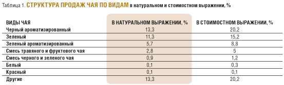 Второе и третье место по долям продаж занимают черный ароматизированный и зеленый чай. Такое соотношение долей в натуральном и стоимостном выражении объясняется тем, что большинство продуктов традиционного черного чая относятся к среднему и экономичному ценовым сегментам. Стоит отметить, что одной из самых быстрорастущих остается категория ароматизированных чаев.