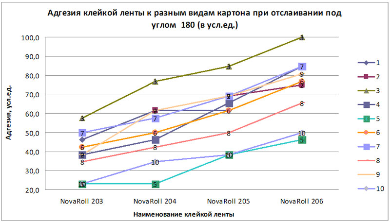 В таблице представлены данные в процентах (%) по отношению к результатам тестирования лучшего образца взятого за 100 %. По результатам тестирования видим, что лучший результат по адгезии и времени отслаивания получен на крашеном макулатурном отечественном картоне. Худший результат по итогам тестирования (когда показатели на всех марках липкой ленты менее 60 % от наилучшего результата) получен на образцах макулатурного отечественного картона - 2, а также на образцах макулатурной отечественной бумаги, хотя по результатам тестирования на ЗАО «ГОТЭК» это был лучший образец.